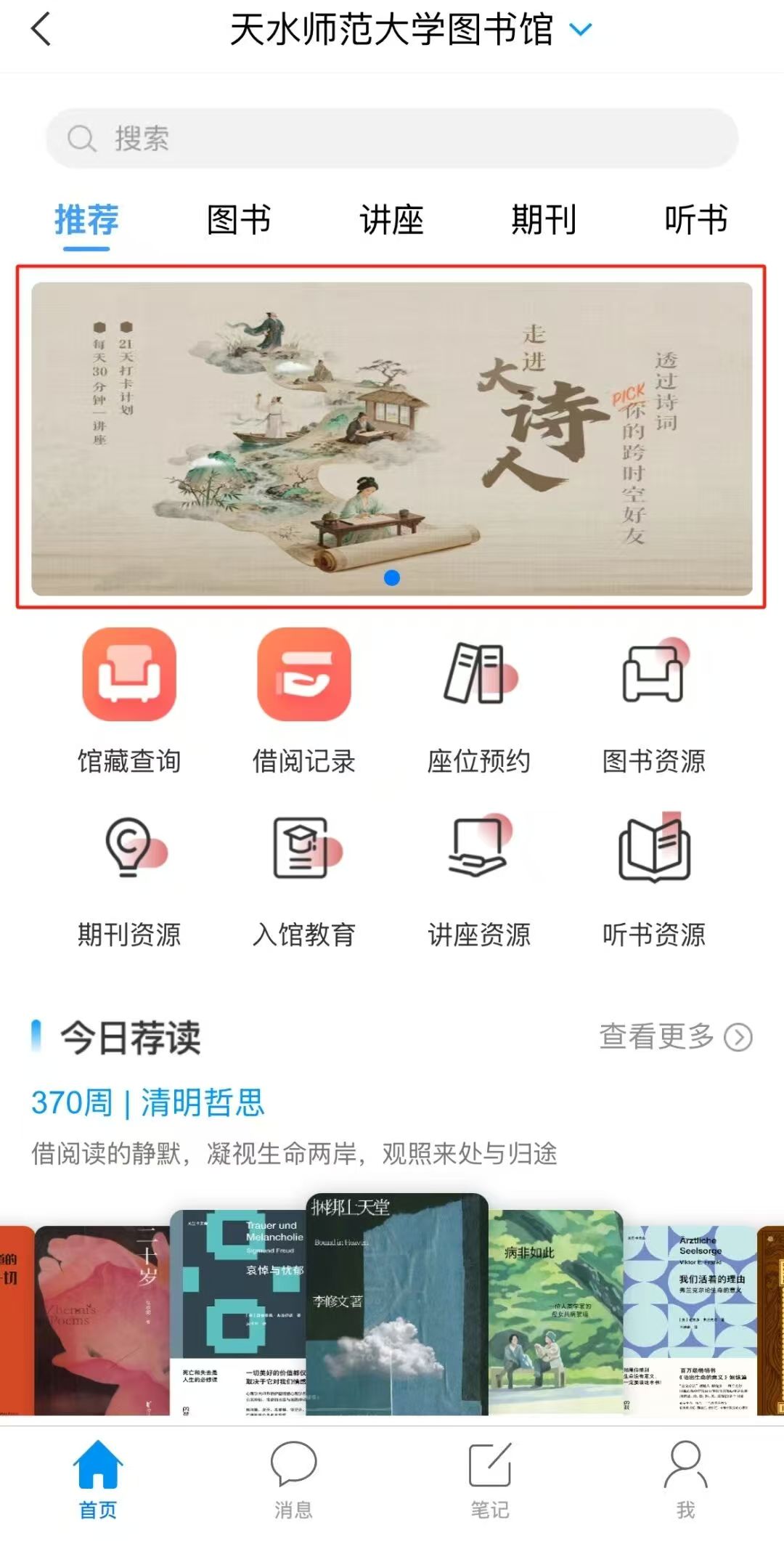 下载“学习通” App,在首页右上角输入邀请码tssftsg进入图书馆首页