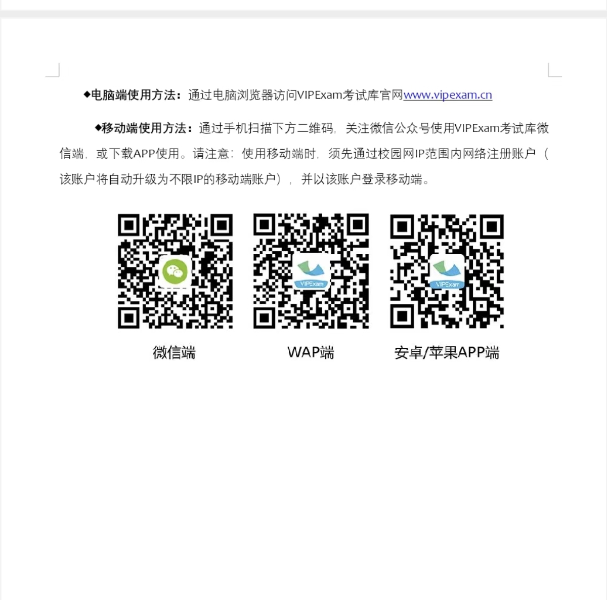 ◆移动端使用方法:通过手机扫描下方二维码,关注微信公众号使用VIPExam考试库微信端,或下载APP使用。请注意:使用移动端时,须先通过校园网IP范围内网络注册账户(该账户将自动升级为不限IP的移动端账户),并以该账户登录移动端。